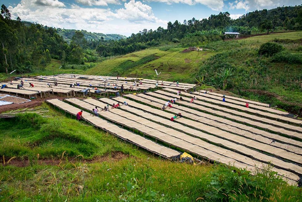 Our first stop was the Gashonga cooperative’s washing station. Gashonga produces a high quality fair-trade coffee known for its sweet flavor along with spice notes of clove and cinnamon. This station is where the farmers take their coffee after the red coffee cherries are picked from their trees. These coffee cherries are carried in sacks resting on the shoulders of the farmers as they make long sprints to carry the bags to their destination often on only muddy dirt roads. At the washing station local women workers line up in long rows hovering over the green beans that have been freshly separated from the red outer cherry exposing the light green bean underneath. It is the job of these women to sort through and dispose of the imperfect beans. They continue to do this while the bean dries over several days. Their work is momentarily interrupted when rain showers suddenly threaten to soak everything. These women hustle to cover the beans to protect them. As soon as it stops, they quickly work in unison to uncover and continuing to pick and sort. Wasting time is not an option.